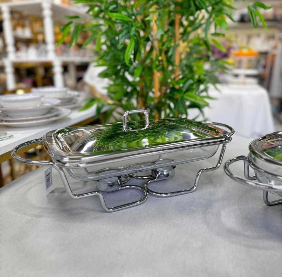 Donji dio je kromiran , Pravougaona vatrostalna zdjela , poklopac od inoxa , sve to se nalazi u ovom setu na slici .